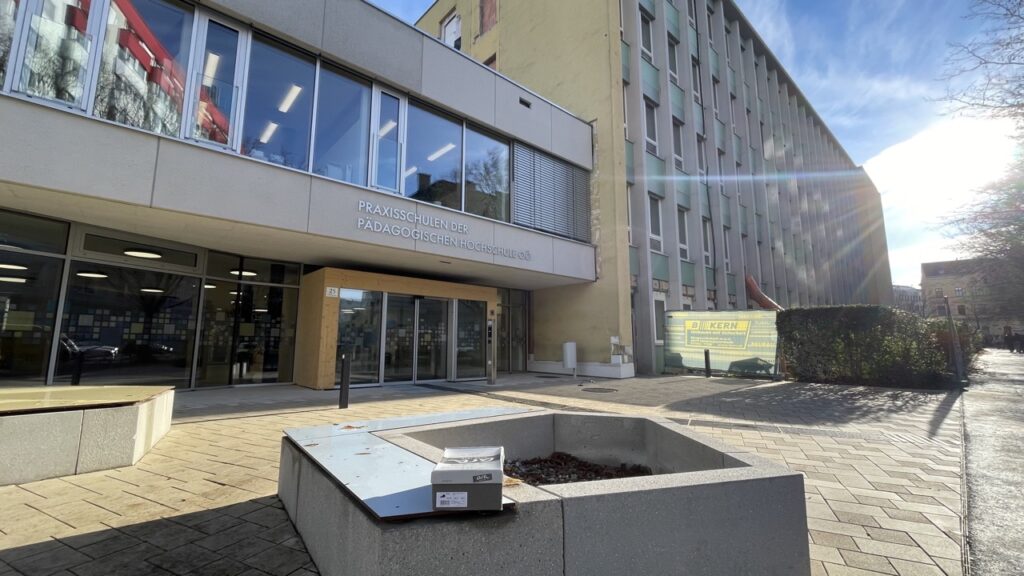 Wie später auch ein Schüler sein Daumenkino mit einer rotierenden Uhr zeichnet, vergeht die Zeit rasant. Und als niemand auftaucht, der mich abholt, spreche ich eine Lehrerin an, die soeben ihr Auto parkt. „Wer? Frau Schuster?“ Sie dreht sich zu einer anderen Person: „Kennst Du die?“ – „Achso! Huemerstraße!“ Und da klingelt auch schon mein Telefon. Die Pädagogische Hochschule arbeiten in mehreren Gebäuden. Natascha wartet auf mich in der Huemerstraße 3-5, wo sie mir auch schon entgegenlacht. Jetzt endlich macht die Beschreibung auch Sinn: Links am Parkplatz vor dem Gebäude. Auf in den fünften Stock!