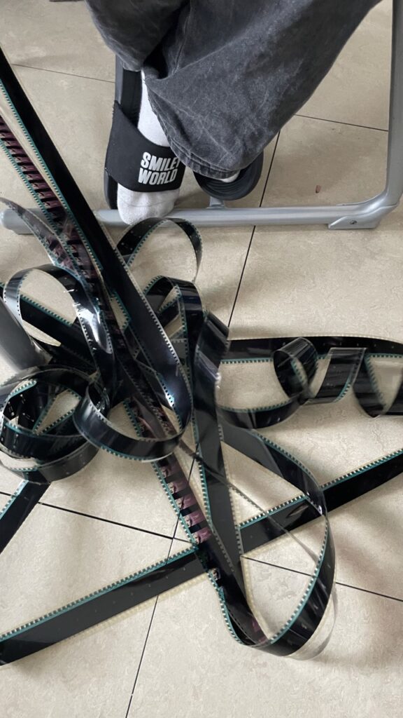 Am Gang tobt schon unsere Klasse. Ein Tumult, der die Lehrerin laut werden lässt. Welch respektloser Empfang für einen Gast, der uns einen Workshop bringt. Es beruhigt sich rasch und die Bühne gehört mir. Die Schüler:innen sind auf Zack. Ich gebe die 35mm- Filmrolle durch und rolle sie zum ersten Mal zur Gänze ab. Wir müssen den Streifen zickzack durch die Menge weiterziehen. Sie sehen die Kader, erkennen den Zusammenhang. Vergleichen mit dem digitalen Projekor an der Decke. Das Bilder-Quiz lässt viele Hände hochschnellen und wir bauen Brücken zwischen Präsidenten und Kriegen, Energie und Kraftwerken, Häusern und Werten, wie Familie und Klimaschutz. Wir verstehen uns.